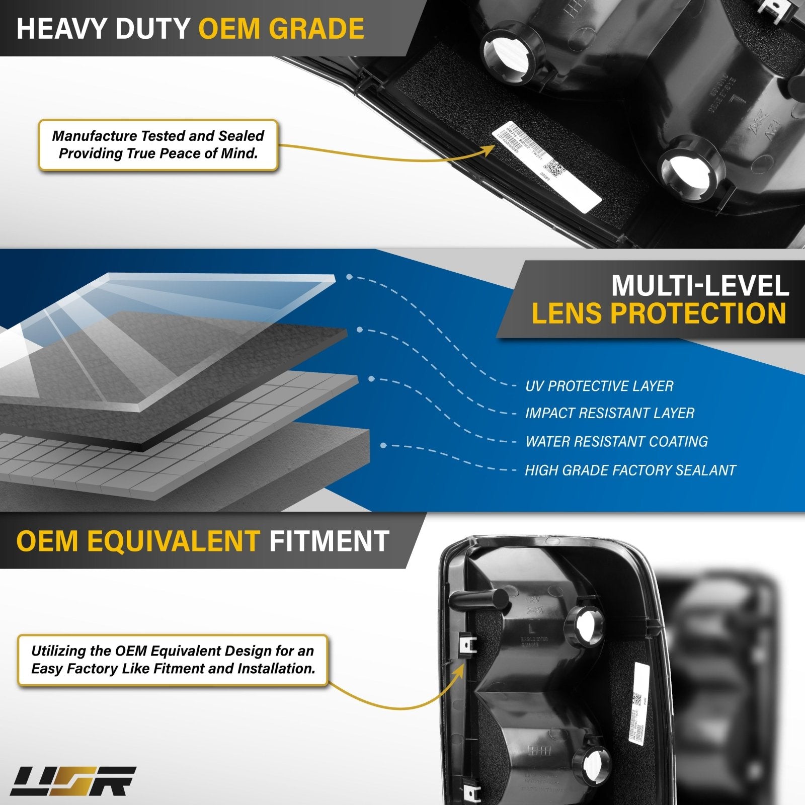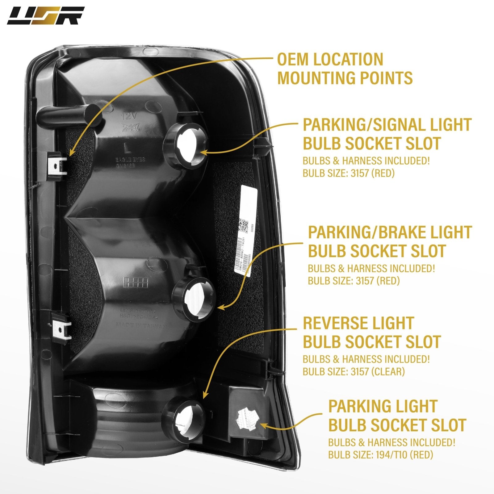 • Bulb Specifications: Red 3157 Parking / Signal Light, Red 3157 Parking / Brake Light, 3157 Clear Reverse Light, Red 197/T10 Parking Light.