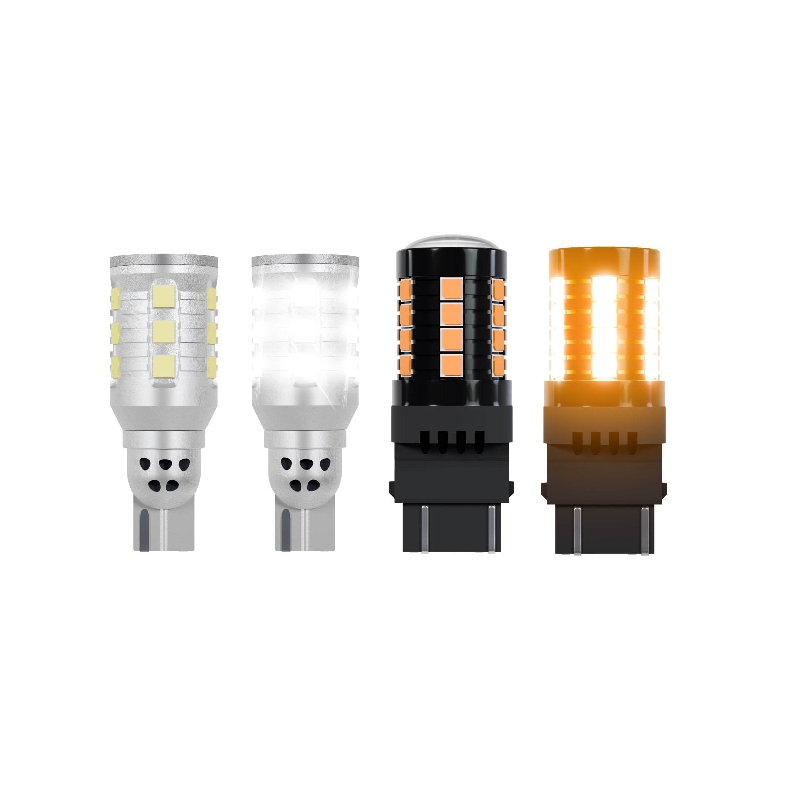 There are two main types of Day-time Running Lights Halogen DRL vs. LED DRL. There are other types of DRL, however to keep things simple, we will focus on the two main types. The picture example above shows the different projections between LED and Halogen.