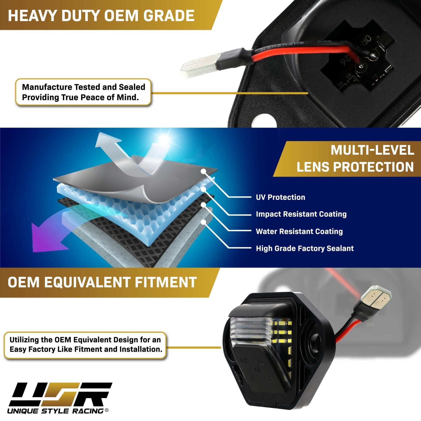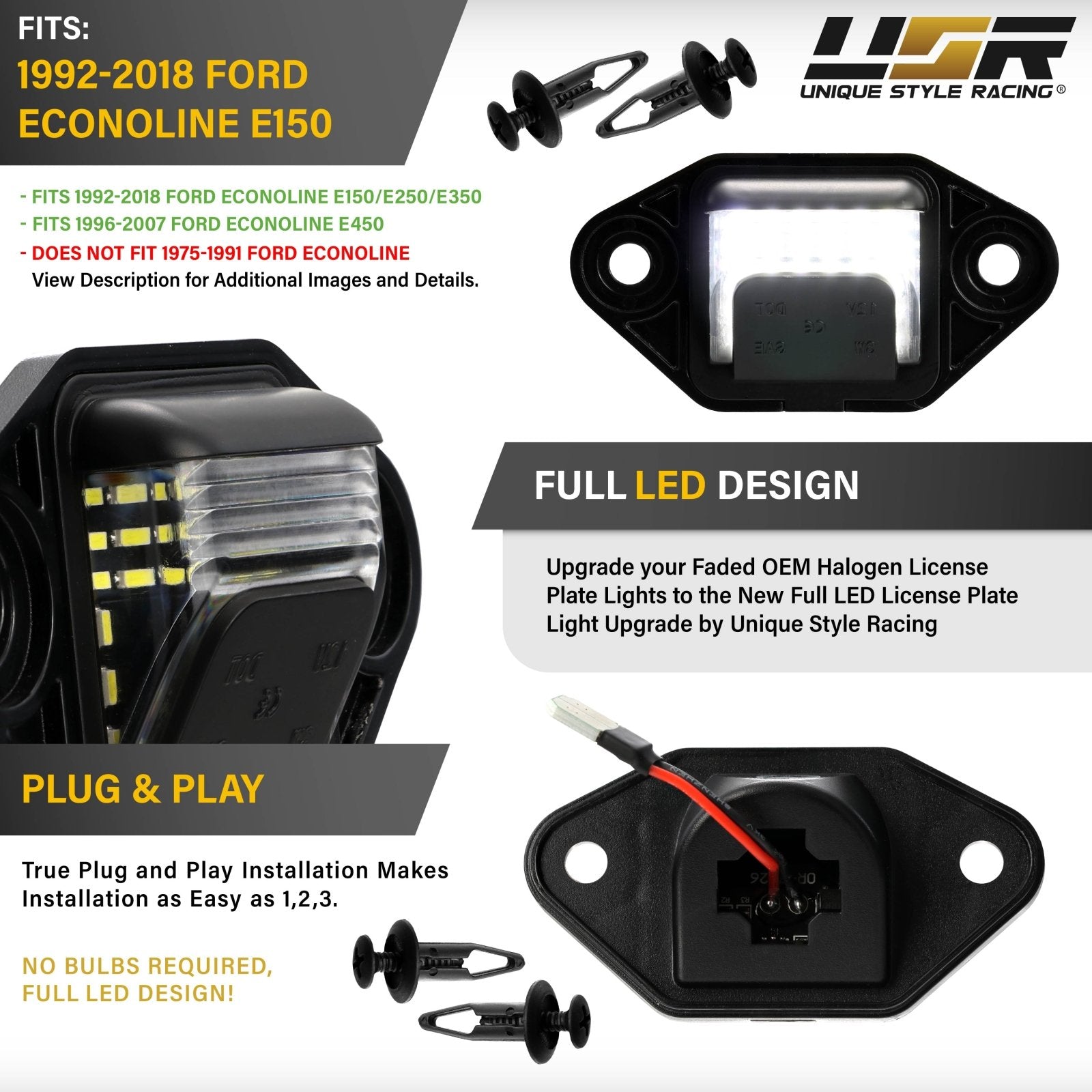 • Built-in Super Bright High-Quality Hi-Power SMD LEDs providing a White and Red Output on each side of the License Plate Light, Long Lasting and Energy Efficient.