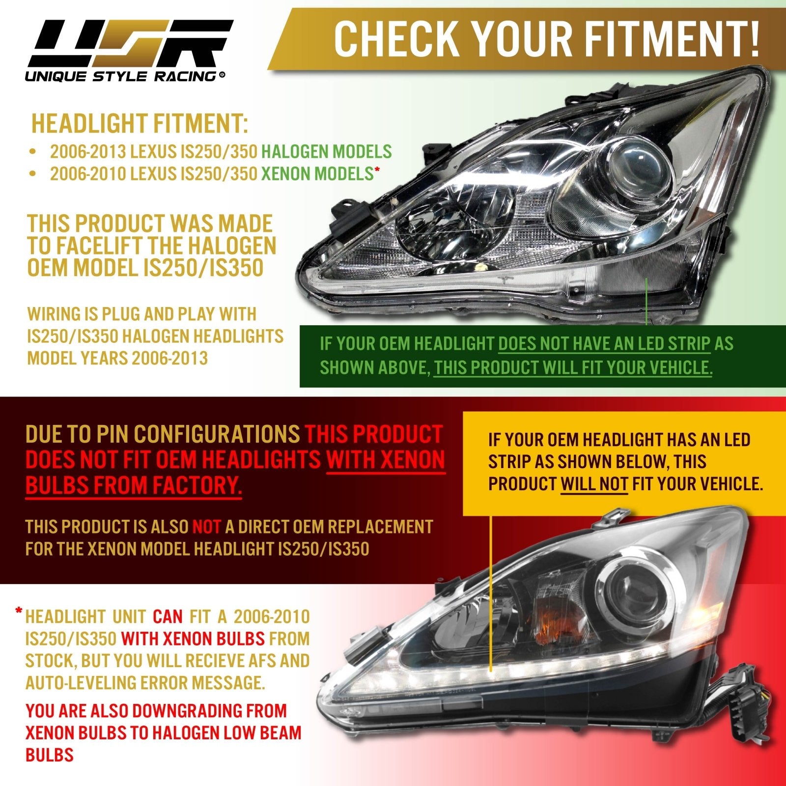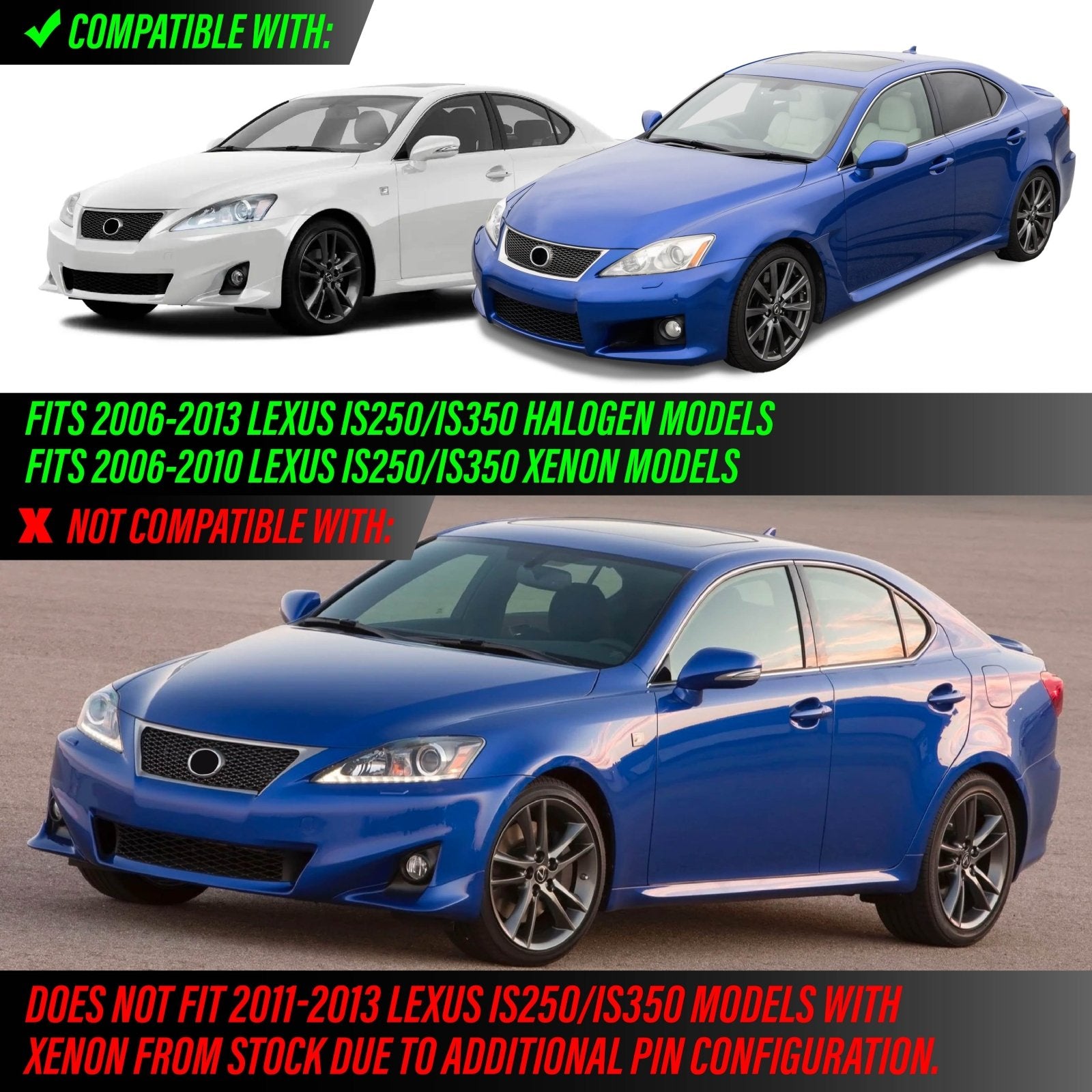 • Will NOT fit 2011-2013 Models with Xenon from Stock due to additional Pin Configuration. - Can fit preface 2006-2010 IS250/350 with Xenon from stock, but you will receive AFS and Auto-Leveling error message. You are also downgrading from Xenon to Halogen Low Beam Bulbs.