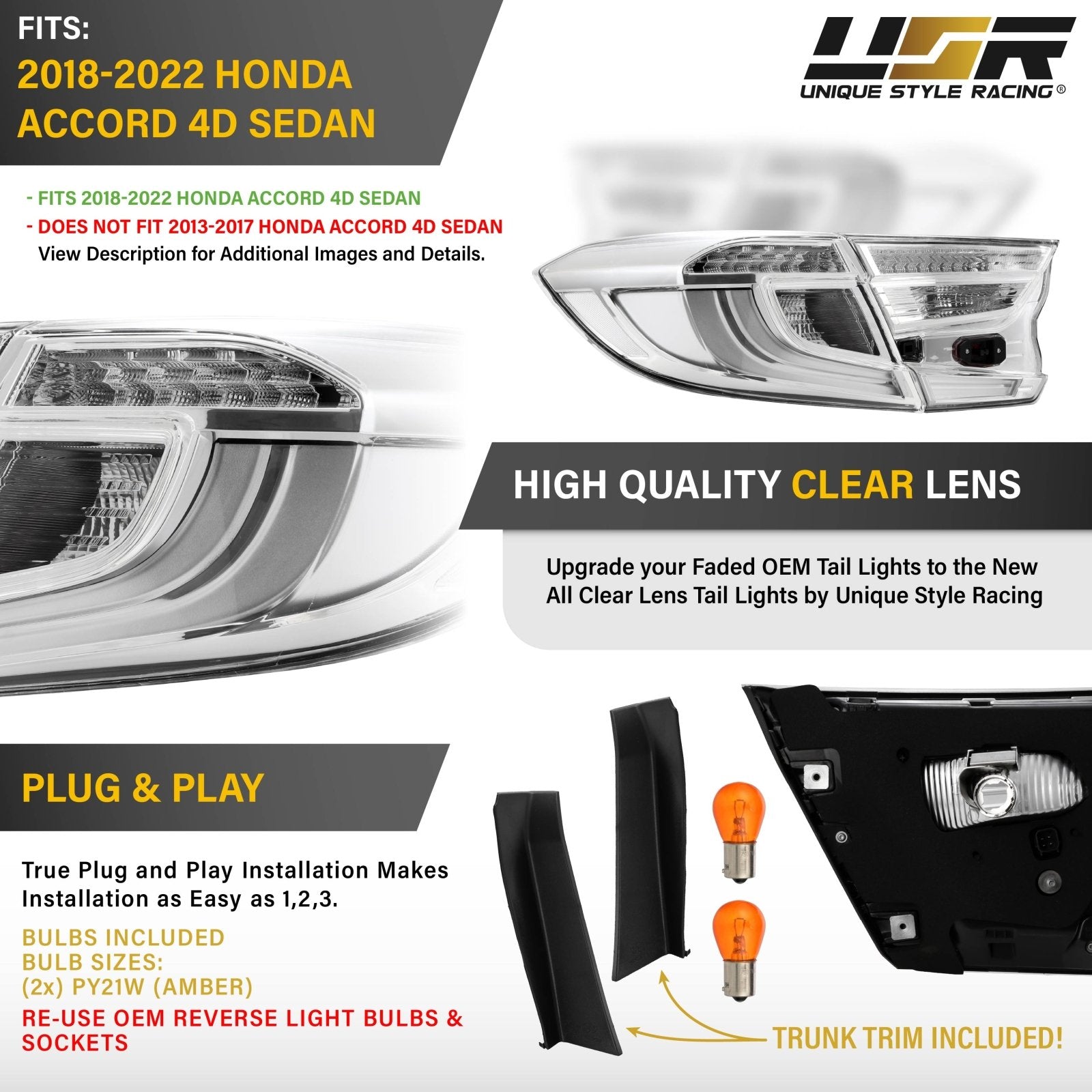 • Also Fits Base Model 2018-2022 Honda Accord 4D, But The Touring Trim Wire Harness is Required for Inner Brake Lights to Illuminate.