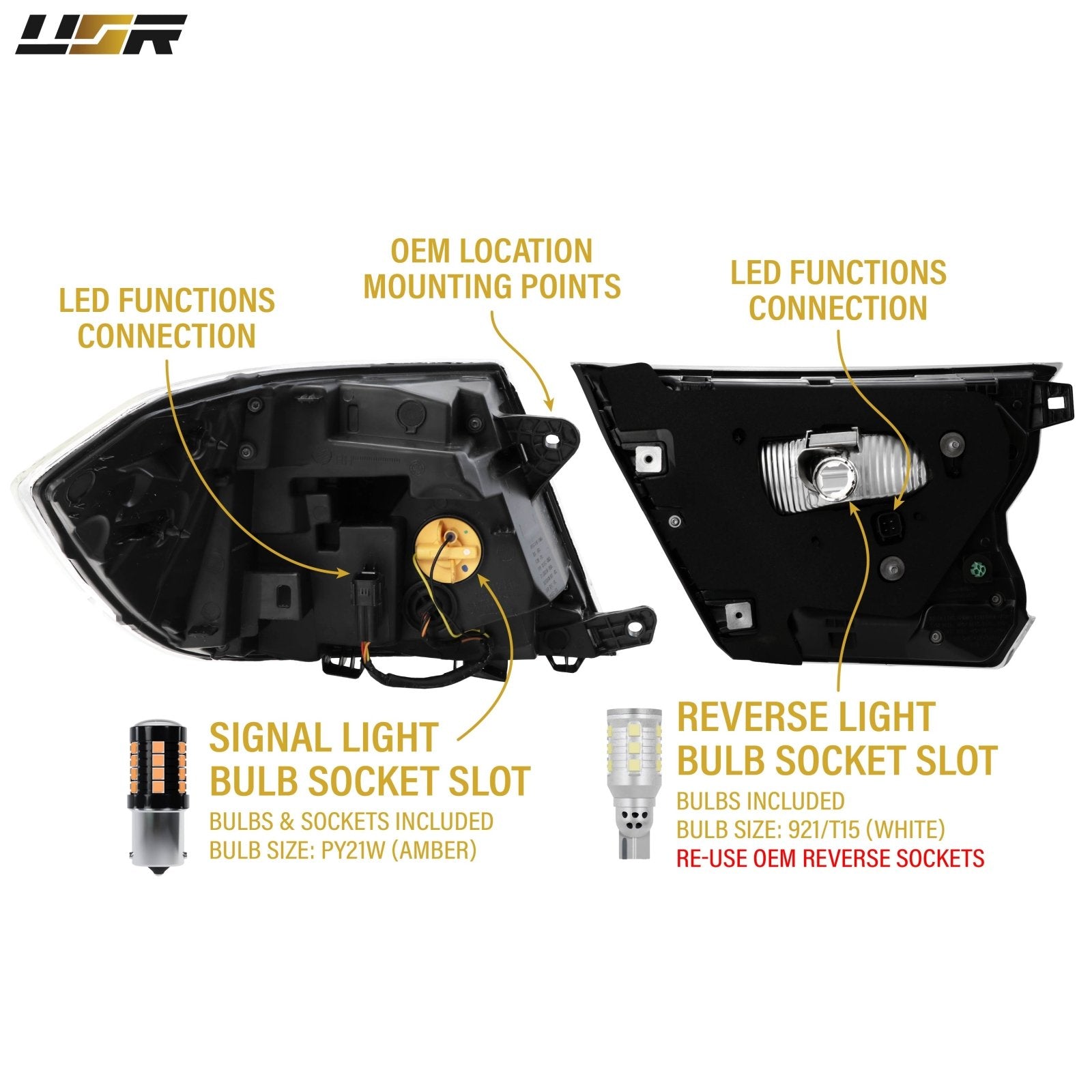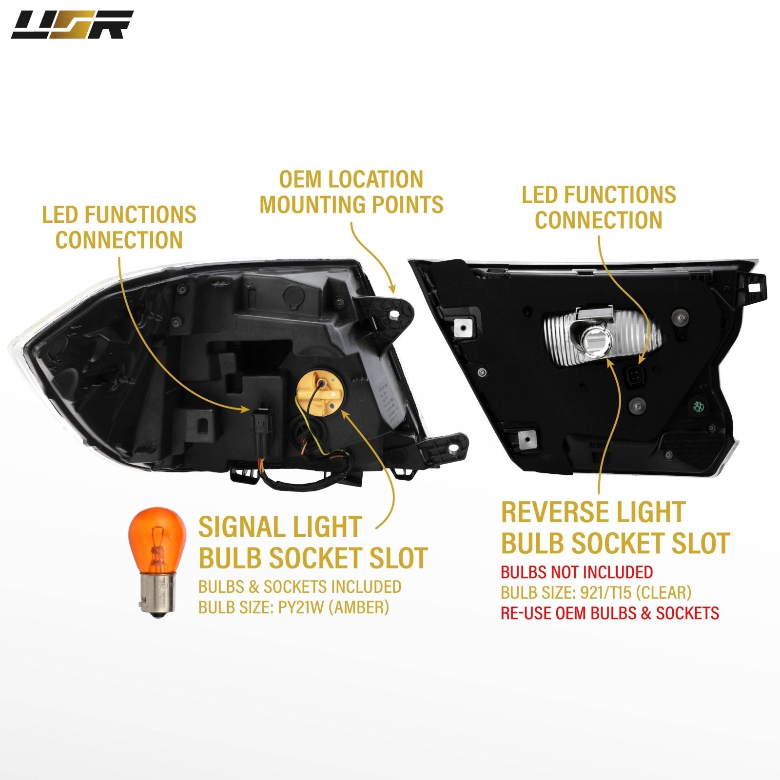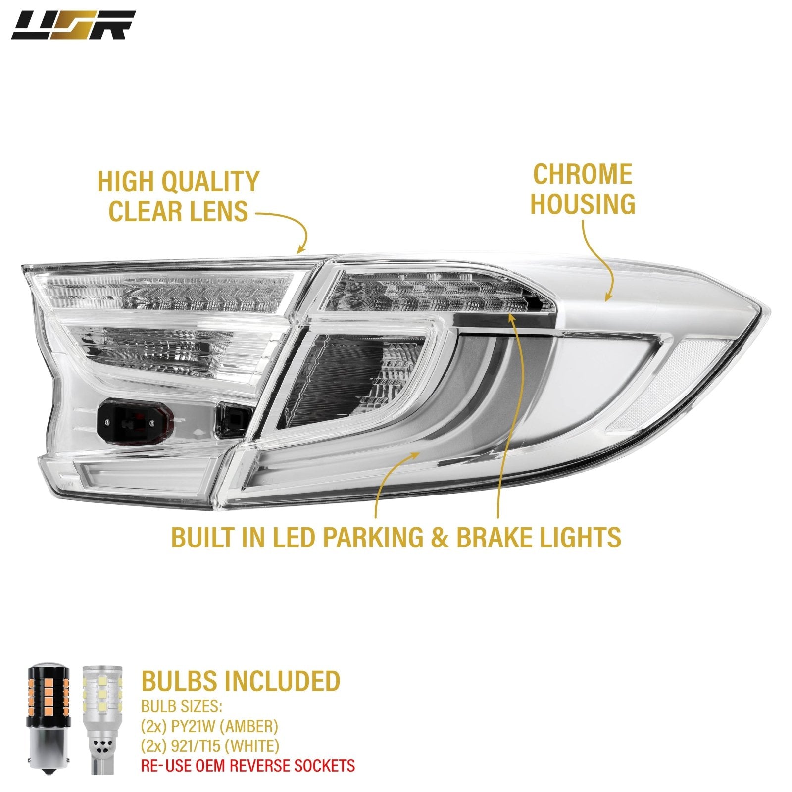 • Bulb Specifications: Built in LED Parking / Brake Light, PY21W Signal Light, 921/T15 Reverse Light.